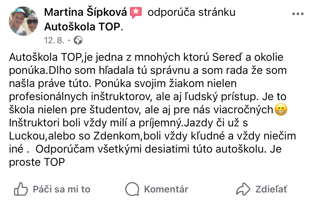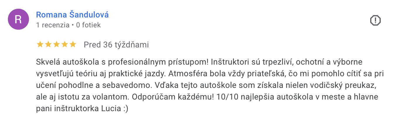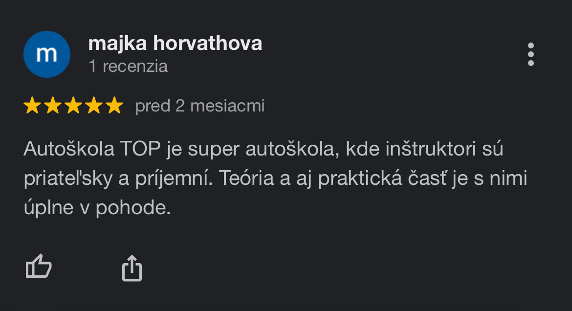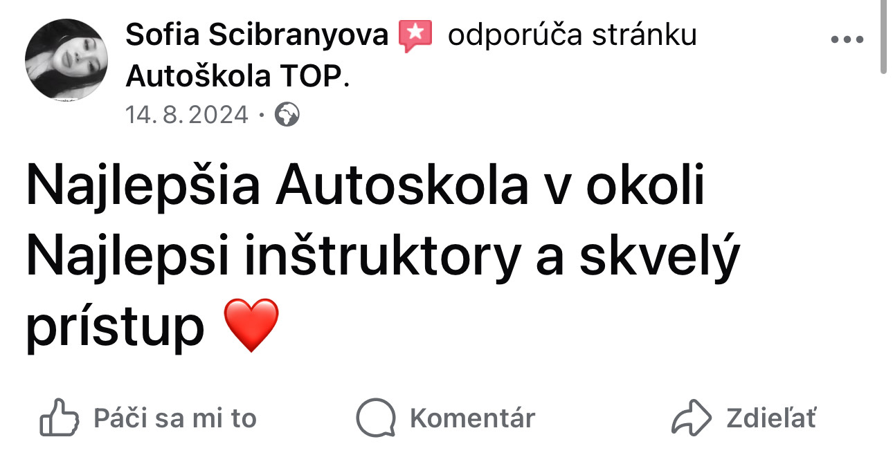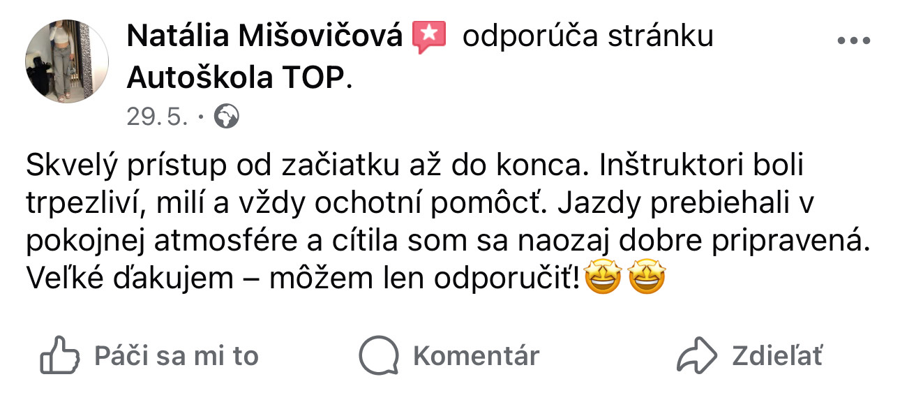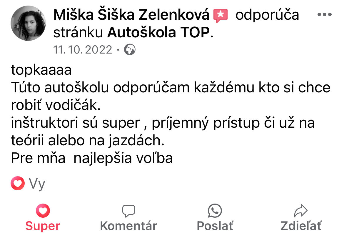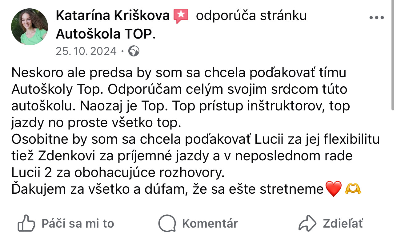 Naši absolventi neustále vyjadrujú svoje nadšenie a spokojnosť s Autoškolou Top! Sme hrdí na ich pozitívne recenzie, ktoré svedčia o našej kvalitnej príprave na ich cestu. S profesionálnymi inštruktormi, modernými vozidlami a osobným prístupom sme spoločne pomohli našim študentom získať dôveru za volantom a úspešne dosiahnuť vodičský preukaz. Pridajte sa k spokojnej komunite našich absolventov a zažite výnimočnú Autoškolu Top!